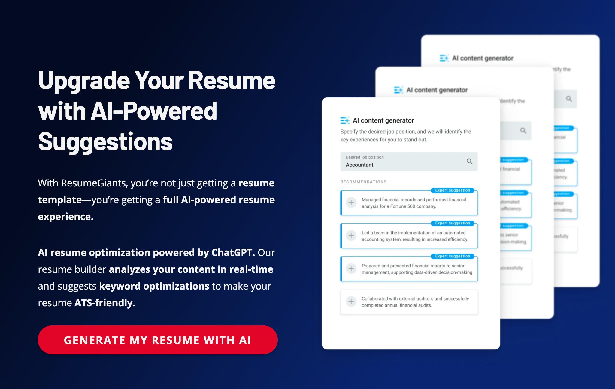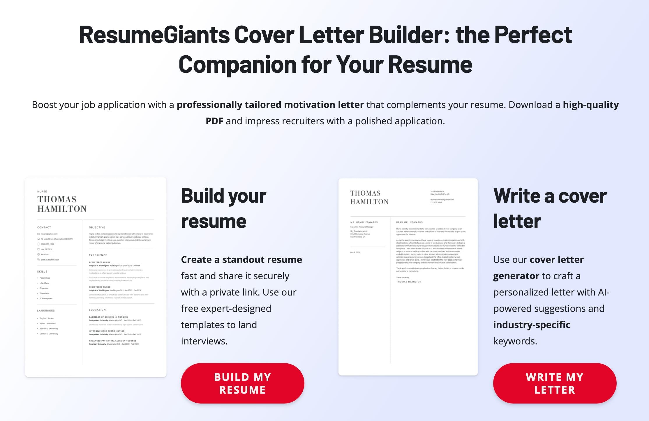 ResumeGiants is a multi-layered resume and cover letter creator that creates, elevates, and optimizes your documents for the ultimate job search. It is great for beginners, career changers, and seasoned professionals. Moreover, it helps non-English speakers and those with limited resume template creativity reach new heights while also being optimized for ATS.